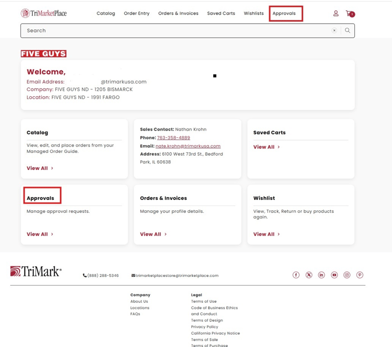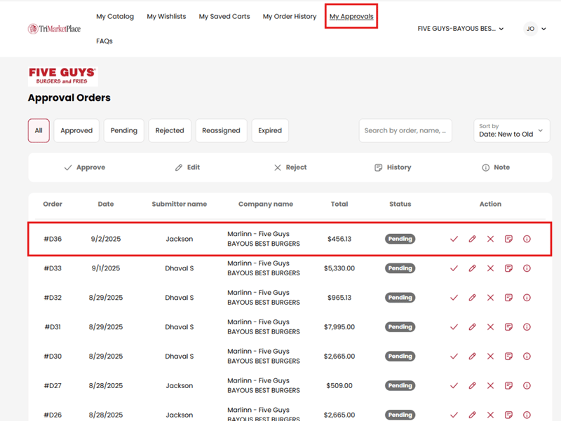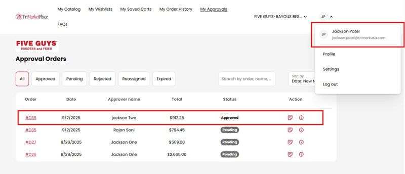 - Once logged into their account, Approver 1 can view all pending orders under the Approvals tab.