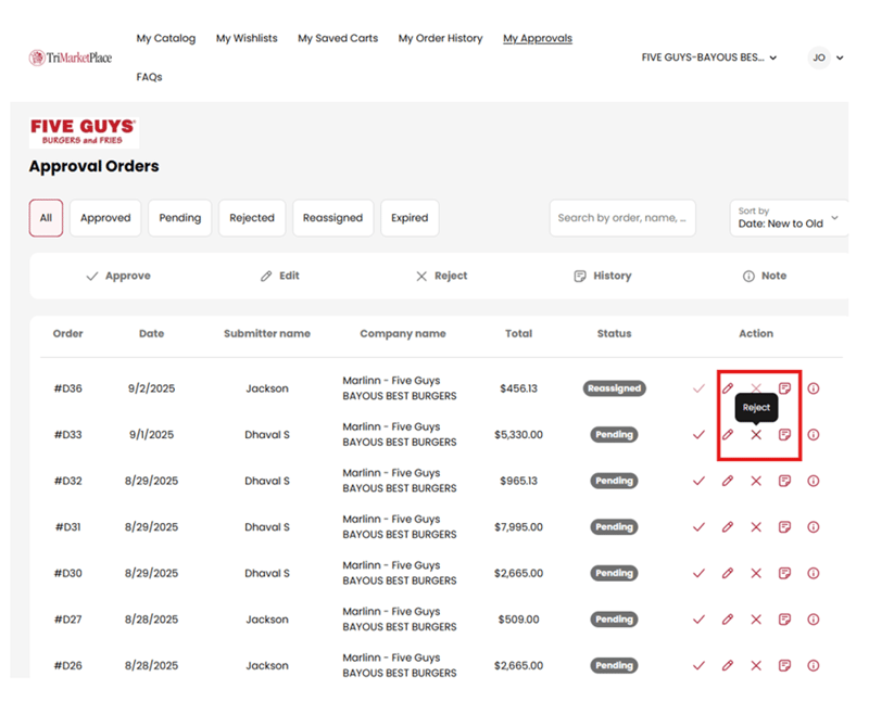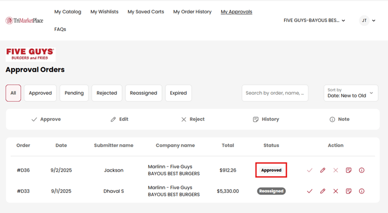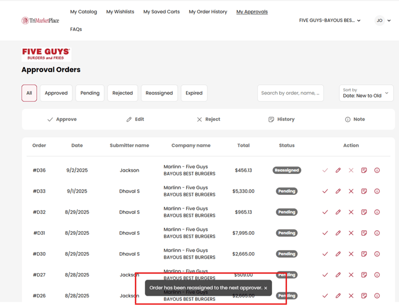 - After Approver 1 approves or rejects an order, the system automatically routes it to Approver 2 for review and approval. Status changes to Reassigned.