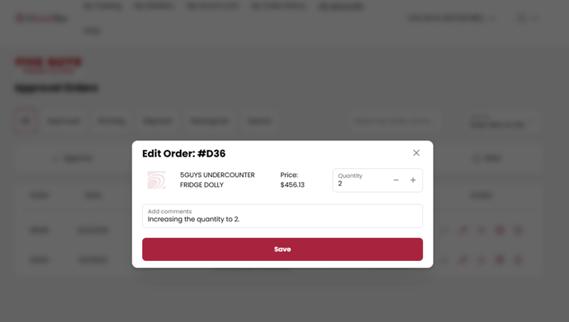 - Approver 2 can edit the order quantity, add comments, and save the changes. If you change the quantity, that will change the Total. On Approving the order, status should change to Approved.