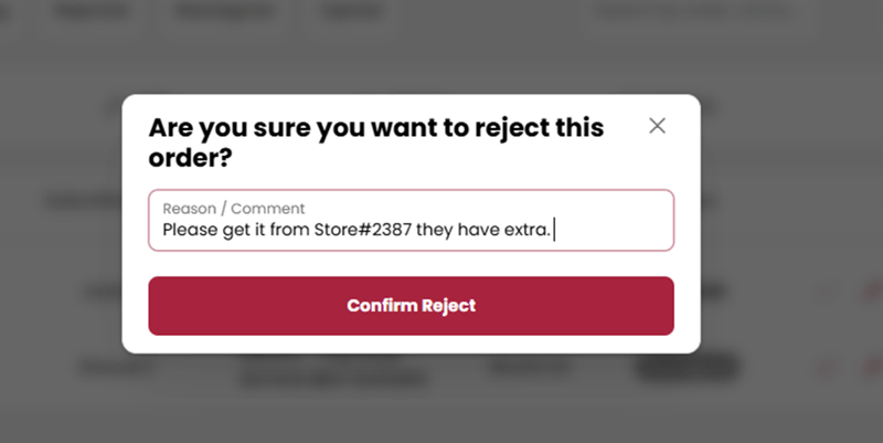 - Order Reject Scenario: If any Approver decides to reject the order, they can click the ‘Reject (X)’ icon. A prompt will appear requiring them to enter the reason for rejection before confirming.