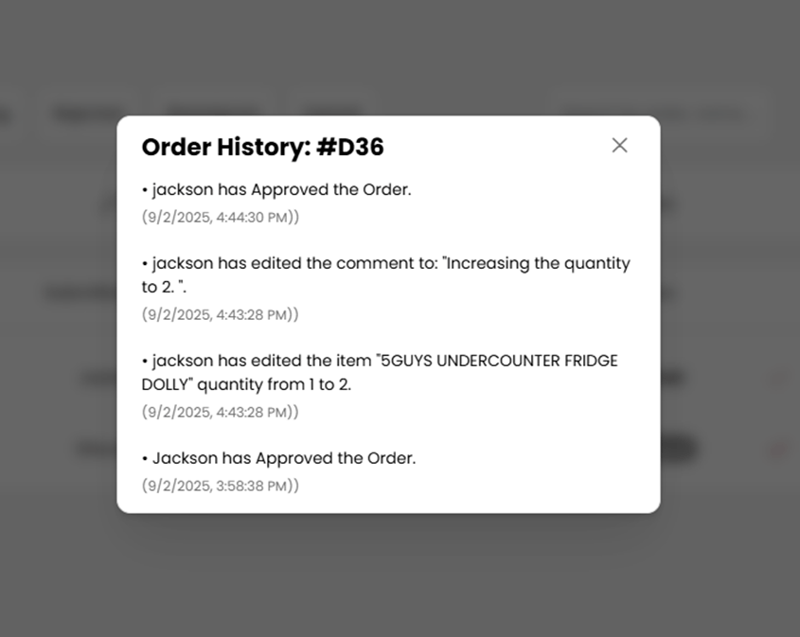- Within the Approvals tab, Approver 1 can search for orders using various criteria, sort orders by date or status, and take the following actions: approve the order, edit the order quantity, reject the order, or view the order history.